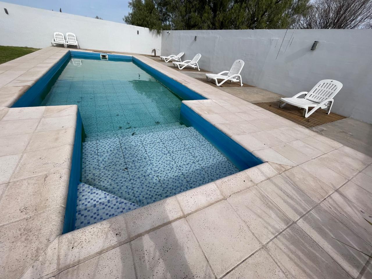 A una de esas cabañas, se le anexa un quincho/cochera. Y la cuarta, cuenta con dos dormitorios, baño completo, living, cocina/comedor más lugar para cochera, también tiene una lavandería, un segundo baño con ducha fuera de la cabaña para ser utilizado como complemento de la piscina que cuenta con todo su equipamiento, veredin y solarium.